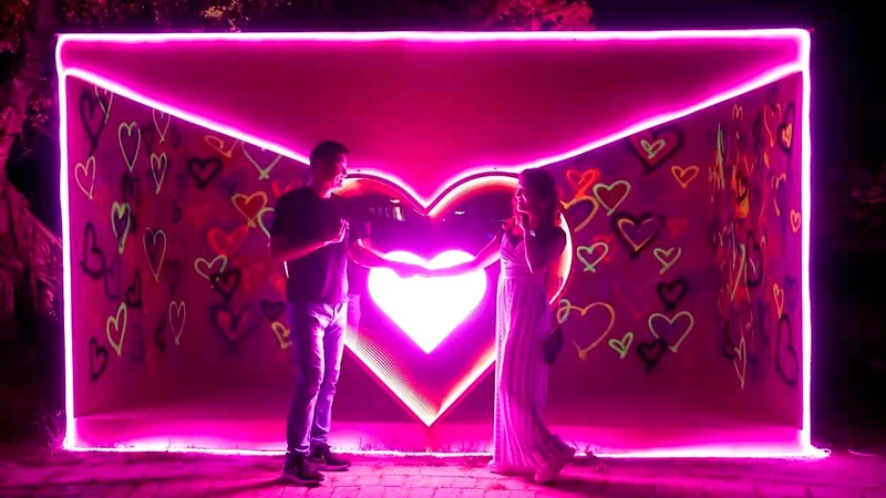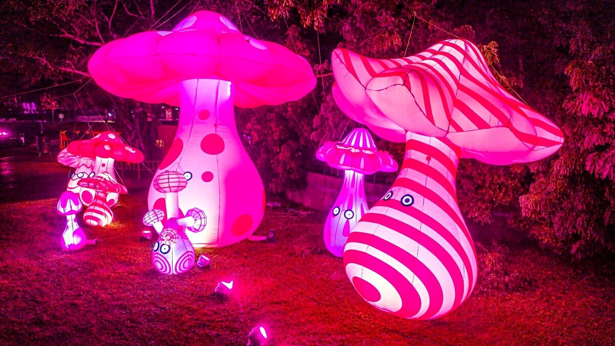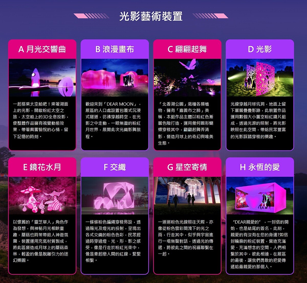 全區會有8大粉紅裝置藝術,入口處的包覆沉浸式隧道「浪漫畫布」,預告將走進一趟奇幻冒險。「月光交響曲」是在湖面上打造有3D全息投影的太空船,帶有動態視覺效果超好拍!「光影」則用大小鏤空粉紅鐵片,在光源投射下製造趣味視覺效果;由一條條粉色編繩布置的「交織」,在陽光及燈光投射下,產生奇幻感受。最後別忘記到「永恆的愛」,把最真摯的感情傳遞給心愛的人。