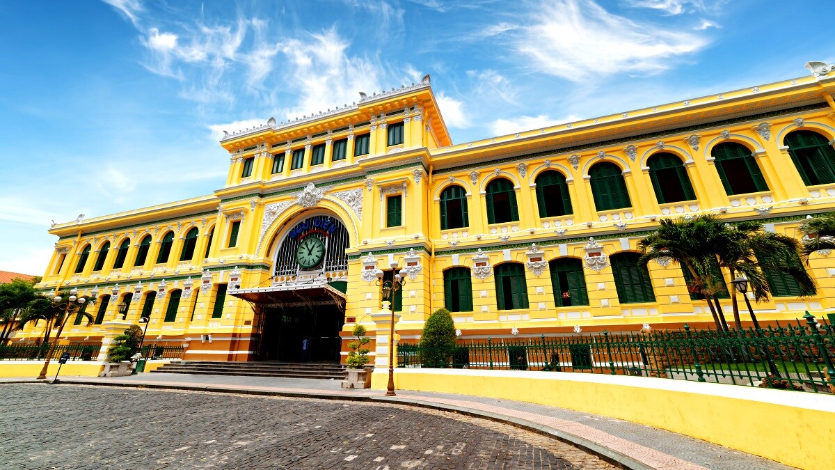 原名為西貢中央郵局的「西貢中心郵政局 Saigon Central Post Office」由法國興建,是越南最古老的郵局,於1892年正式啟用。法式建築風格搭配越式裝飾別有一番風味。入內可以看到正中央掛著「越南國父」胡志明的肖像,以及正忙在處理郵務的櫃台。大家可以在紀念品店挑選明信片、在櫃檯辦理寄送。酒紅色復古的木製電話亭是觀光客必拍位置,可以趁早上人潮較少時去參觀。