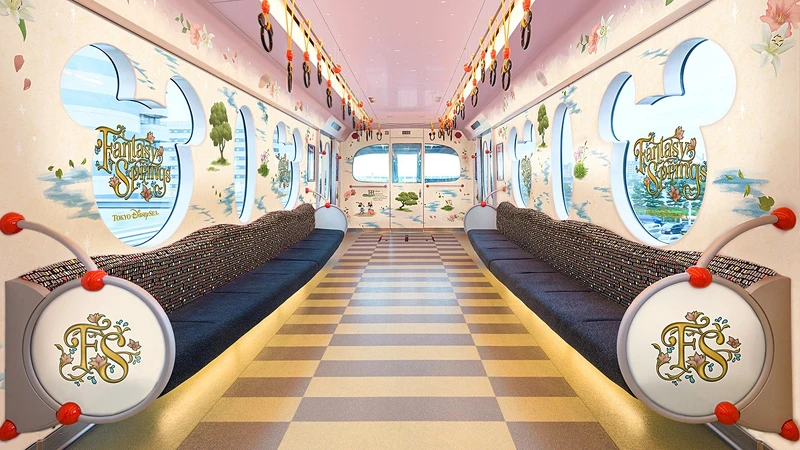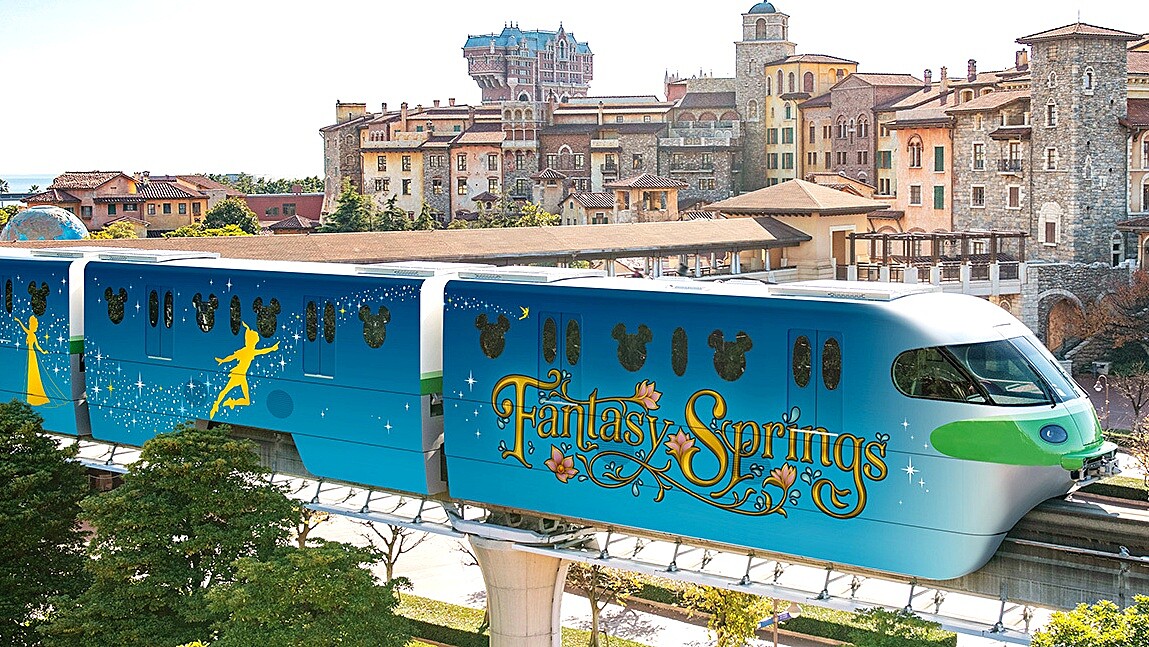 在JR舞濱車站的單軌電車「迪士尼度假區線」,5/7起為電車換上全新的「夢幻泉鄉Fantasy Springs」設計!外型塗裝以這次的夢幻藍色調為主,上面還小飛俠與公主剪影,宛如帶領遊客一同前往全新夢幻天堂!內部空間也令人眼睛一亮,淡雅色調上增添多處植物元素,象徵的美好春天意象,即便早起入園,光看到這幕畫面精神就立刻來了。