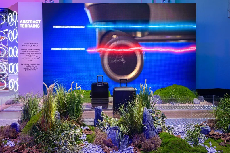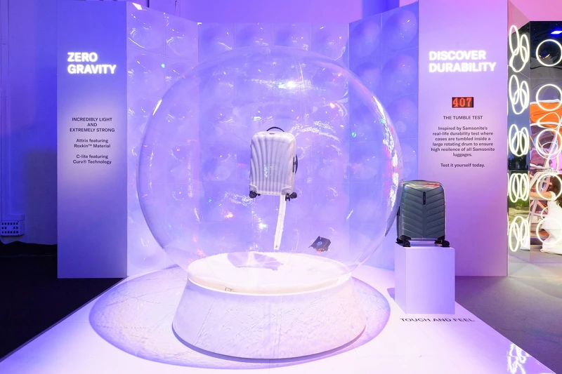 針對這次的亞太區獨家展覽,Samsonite特別規劃了三大主題,分別是「零重力」、「發現耐用性」以及「探索地形」,像是「零重力」以懸掛方式襯托行李箱的輕盈,可以看到由Roxkin™材料和Curv®材料製成的Attrix和C-lite的輕盈概念,而「發現耐用性」則是將一個吸睛的大型滾輪佇立其中,可通過轉動滾輪、翻滾行李箱對行李箱進行耐用性測試。