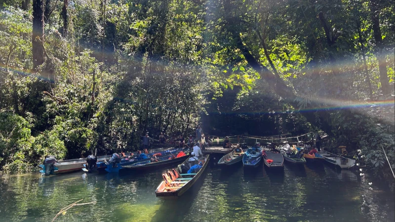在穿越近1小時的雨林漫步後,首先映入眼簾的是商人洞穴,因燕窩和鳥糞可以販售,當地原住民便在商人洞穴搭建簡易木棧,在此形成商業模式,至今仍有些許採集員徒手攀爬在高達80米洞穴中,但這份工作雖危險度高,經濟效益逐漸降低,已越來越少有人願意從事這項產業。