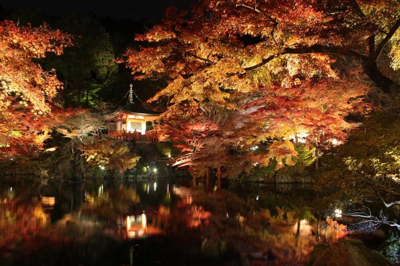 醍醐寺為真言宗醍醐派總本山中被登錄為世界遺產的寺廟,豐臣秀吉一統天下時,除了有一些城市建造之外,其在醍醐寺的「醍醐花宴」的賞花活動更是歷史上廣為人知的宴會。不僅春季賞櫻,豐臣秀吉也曾提到秋季想舉辦一場「醍醐賞楓」,但不盡如人意,豐臣秀吉在實現賞楓願望前,人生即迎來落幕。此更讓醍醐寺內的賞楓美景廣為人知,楓葉映襯了赤紅株紅的本堂,映照在清清水面上,11月中起更在國寶的金堂與唐門實行夜間點燈,使得秋季景致更顯幽美。