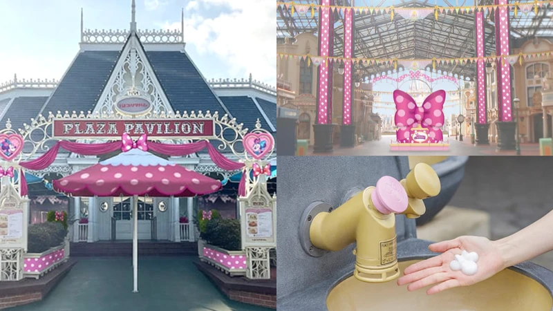 園區內擺滿米妮最喜歡的東西,隨處都能見到代表她的經典元素,打造出一個繽紛世界。入口處有「米妮花園」、世界市集有「大型蝴蝶結紀念碑」、灰姑娘城堡前廣場地板鋪著「粉紅圓點圖案紅毯」以及餐廳前佇立以米妮隨身攜帶的雨傘打造的「圓點蝴蝶結陽傘」,隨手一拍都宛如走進浪漫的粉色泡泡。此外,園區裡洗手區更可以壓出米妮造型的肥皂泡泡,超萌的小設計,令人忍不住想一直洗手。