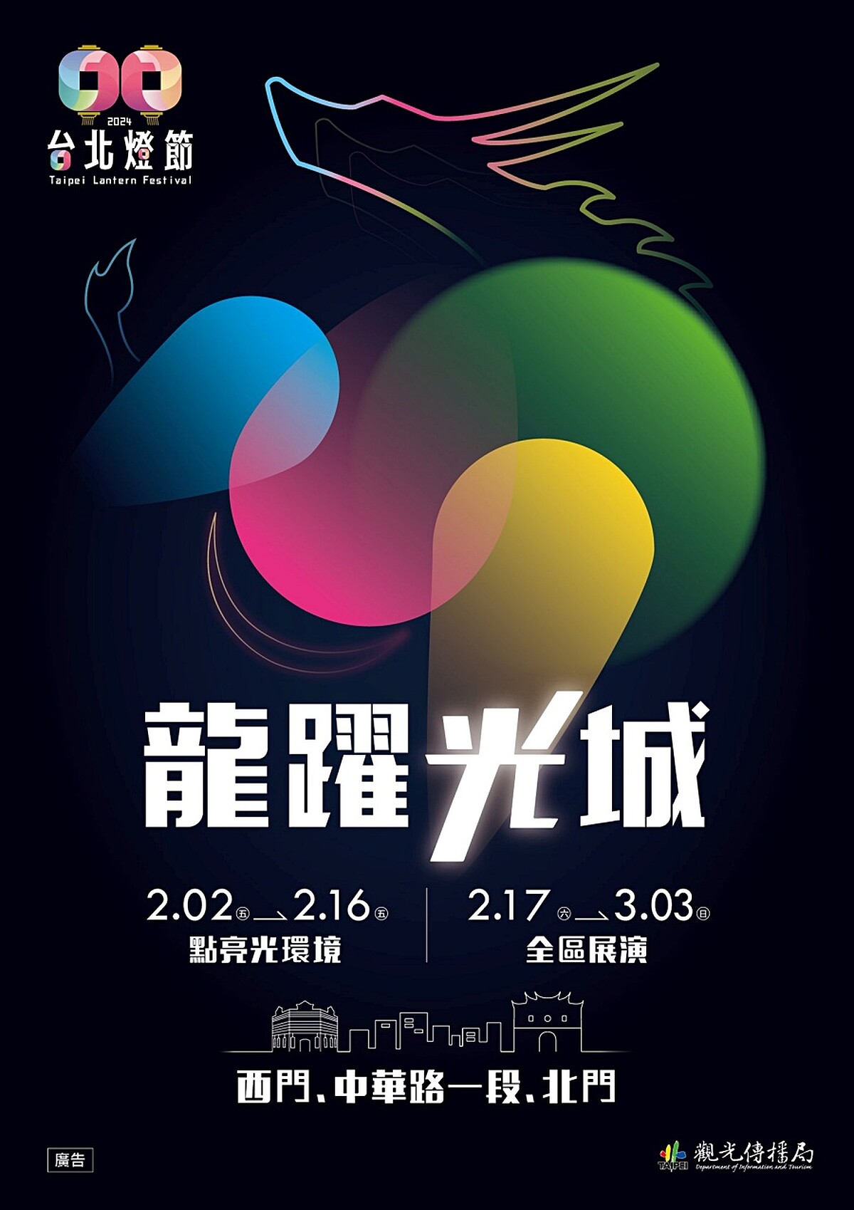 自2017年舉辦以來,台北燈節串聯起城市街道、商圈及在地特色,加上便捷的交通條件,讓無論各地前來的旅客都能深入燈區、感受熱鬧元宵氣息,並帶動人潮與商機。2024台北燈節主題訂為「龍躍光城」,象徵著祥龍飛躍台北城,捎來光彩之意。主視覺以「祥龍」為主角,伴隨著多彩雲霧,在黑夜中展露耀眼姿態,一路飛躍台北、點亮西區,引領台北迎向嶄新一年。