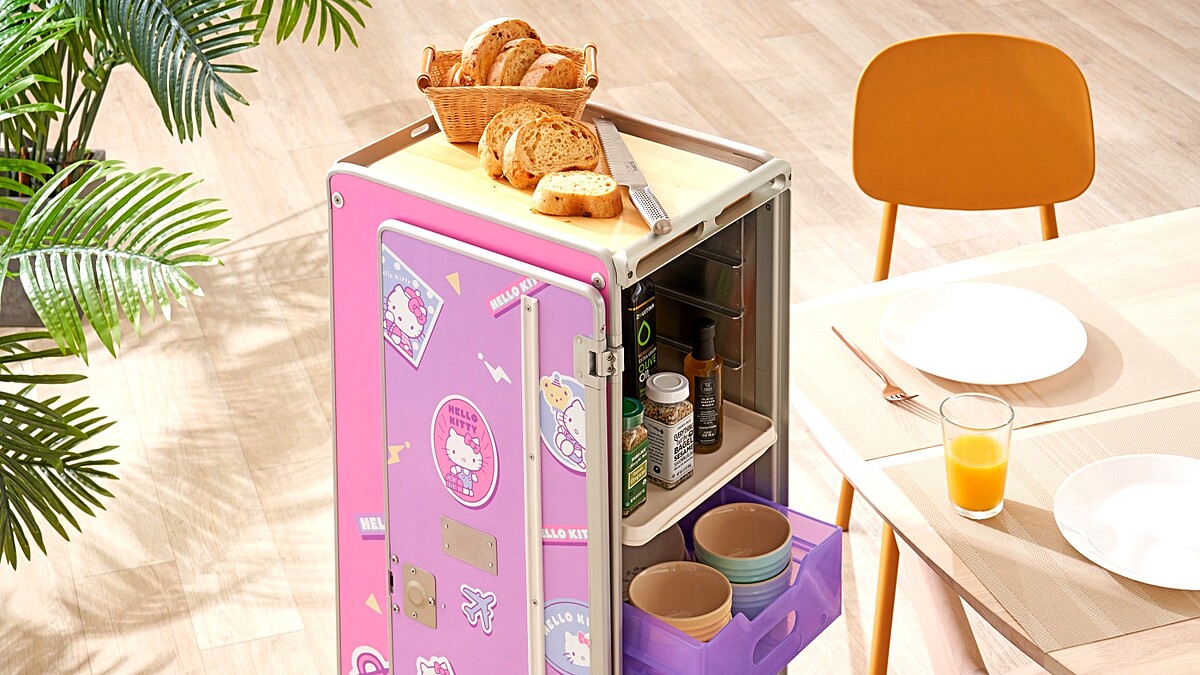 此次的配件也加碼升級,加贈鋁製抽屜分隔板和鋁製酒瓶架,大大提升餐車空間使用性,並另外附贈5個印有Hello Kitty的紫色單軌透明抽屜,可盛裝辦公用品、廚房用品收。加上推車好移動特性,可做為廚房收納、用餐助手、下午茶推車、儲物櫃等多種用途。