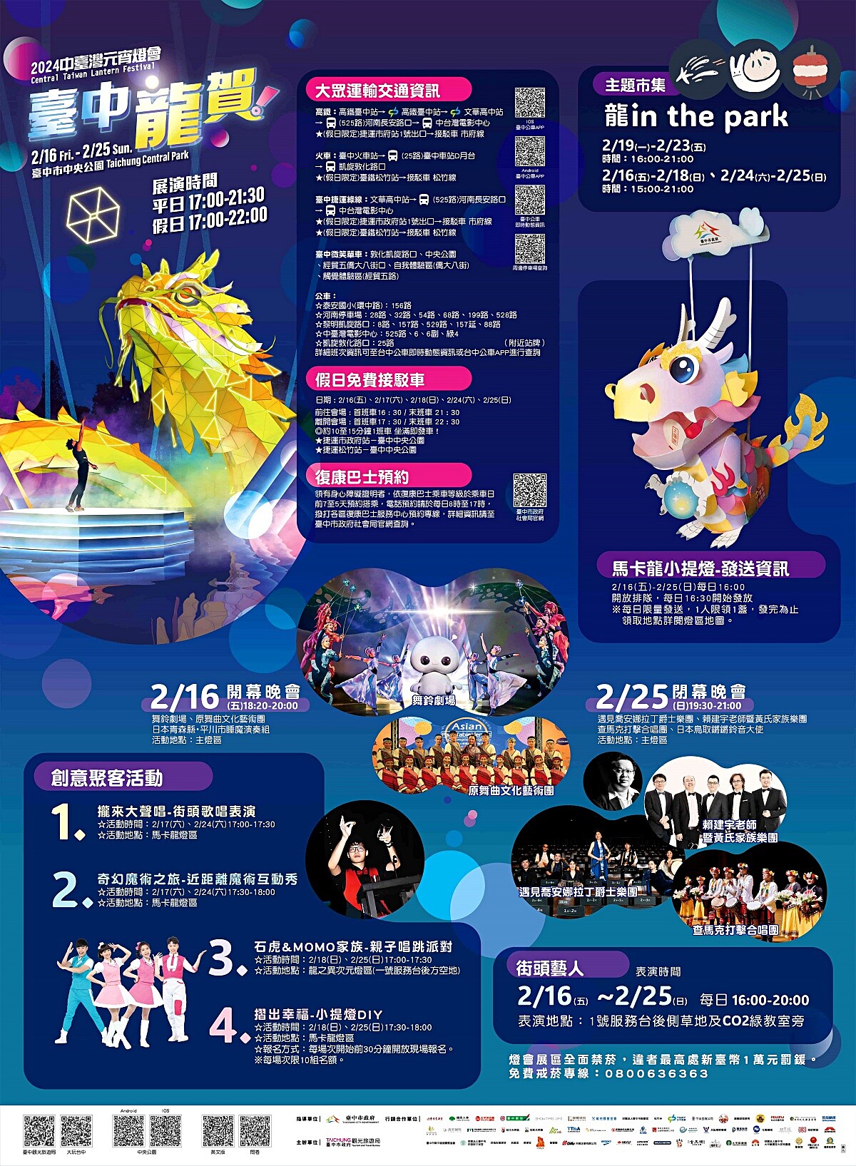 全台各地元宵燈會陸續起跑,在台中登場的「2024中台灣元宵燈會」公開詳細活動資訊,會在中央公園舉辦廣達15公頃的年度盛事,快把必打卡拍照花燈作品記起來。