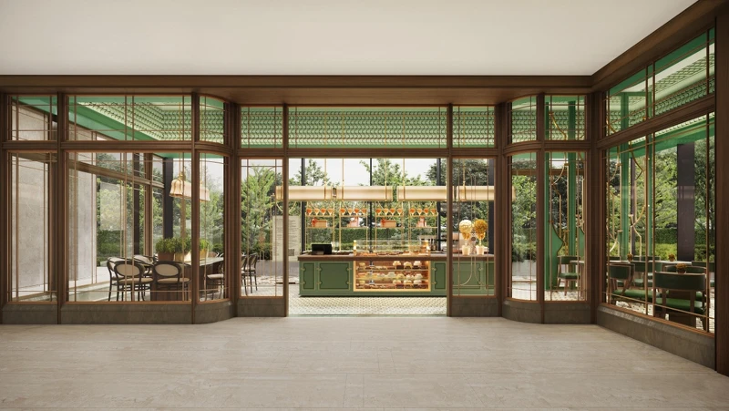 甜點坊面向敦化南路,因而設置了大片玻璃窗,將林蔭大道的自然光線與綠意引入室內空間,再搭配天花板與地板上的細緻圖案,打造出古典優雅的氛圍。設計師 André Fu 同時巧妙的運用溫暖、童趣的色調為整體空間注入現代元素,重新詮釋當代歐式風情。
