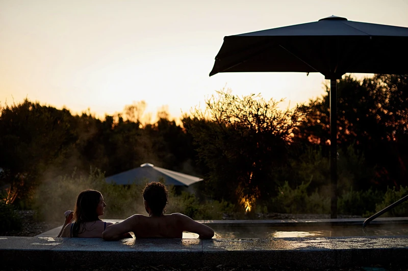 集結溫泉、住宿與美食,才開業一年多的 Alba Thermal Springs & Spa,致力尊重自然、實踐永續碳中和,在佔地15公頃的極簡廣闊空間,為維護天然生態,大量種植與再生當地原生種植物,設有雨林池、森林池、月池、夕陽池、洞穴池和季節性池露台個人池等30多個37°C至43°C的湯泉,提供氯化鈉碳酸氫鹽泉的百分百地熱水,讓人可在搖曳生姿的靜謐樹草叢間,獲得獨特的身心靈五感究極呵護,偶爾還能見到豐富的鳥類飛翔而過,或是邂逅可愛的袋鼠、針鼴在旁探頭的風光。