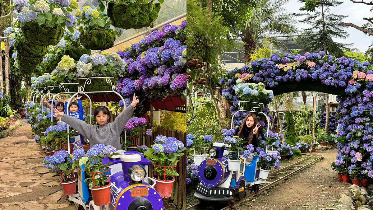 2024年花露農場創意再突破!打造全台唯一繡球花小火車「火車繡」,以繡球花的繡取代秀字,每人只需銅板價50元,就能在乘坐小火車時欣賞美麗花景,還有超可愛繡球花門可以看。小火車上掛滿了一盆盆的繡球花,氛圍感直接拉滿,隨便拍都超好看。這個小火車不分大人小孩都可以搭乘,只是上下車時要小心別撞倒花盆囉。