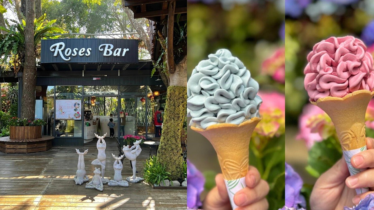 農場內Roses Bar平台也是擺滿滿滿的繡球花造景,在喝下午茶的同時也能欣賞美麗的花。現在更推出應景的「繡球花花淇淋」,有玫瑰、優格、綜合三種口味,超高顏值讓人捨不得吃掉,民眾也直呼200元價格很值得。