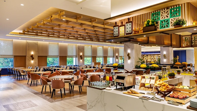 餐飲部分有2樓自助餐「田園西餐廳」、3樓宴會廳;以及設置包廂的32樓中餐廳「福粵樓」,這也是全台最高的福粵樓,精緻港點搭配高空景致非常舒心!田園西餐廳半自助式晚餐推薦菜色有「桃城薄荷雞」、「嘉義東石紙包海鮮」、「油封鴨腿」,早餐更必須來一碗「雞肉飯」及「白醋涼麵」,都是令人口水直流的「嘉香味」。