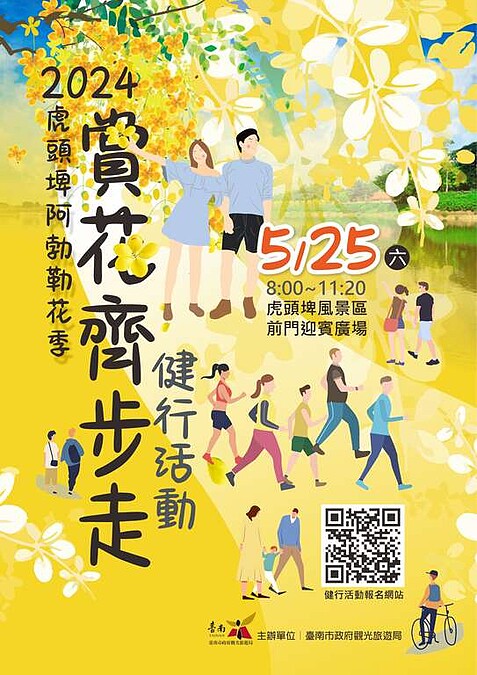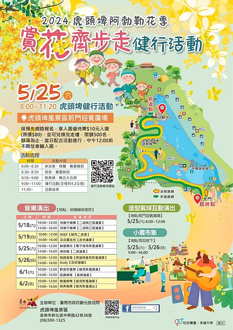 臺南市政府觀光旅遊局、FB「台南旅遊」整理出12大台南最佳觀賞打卡點,邀請大家進行古城美食巡禮之際,順道前往欣賞。另外在5/25(六)會舉辦「2024虎頭埤阿勃勒花季-賞花齊步走」健走活動、5/25及5/26會在虎頭埤風景區雨豆樹下規畫小農市集,能品嚐綠鑽石橄欖、瓜瓜園、竹筍等在地農產品。每個週末時都還有音樂演出,讓遊湖賞花時刻更難忘。
