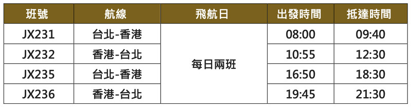星宇航空 台北-香港航班時刻表,每天飛航2班