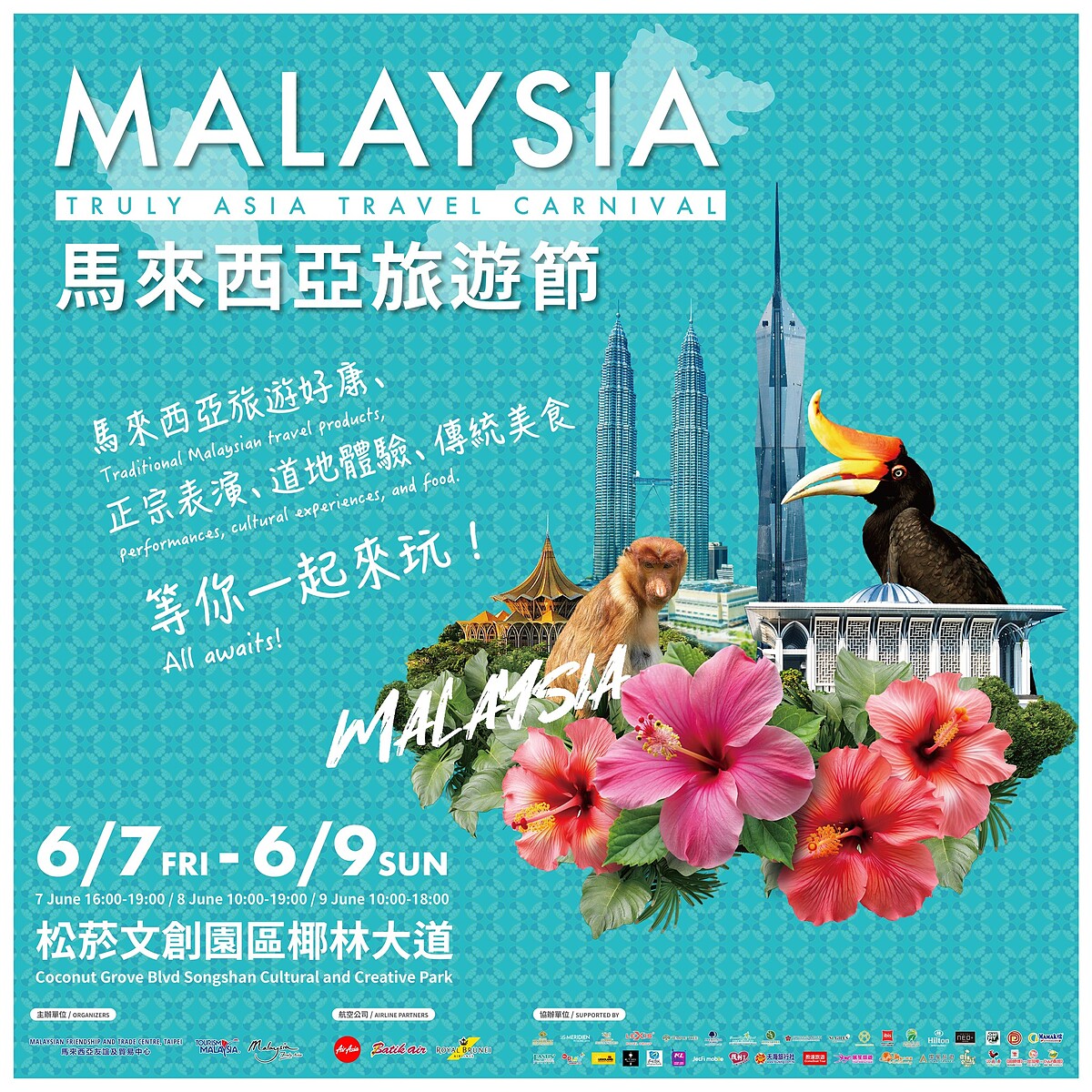 ・「亞洲魅力所在~馬來西亞旅遊節」活動期間,「AirAsia 亞洲航空」「馬來西亞峇迪航空」和「汶萊皇家航空」等三家航空公司,將聯合多家旅行社:找到了旅遊、天海旅行社、盈達旅行社、展笙國際旅行社、世興旅行社、台鋼燦星國際旅行社和愛馬士假期,現場介紹馬來西亞旅遊特色行程,並提供限時優惠。