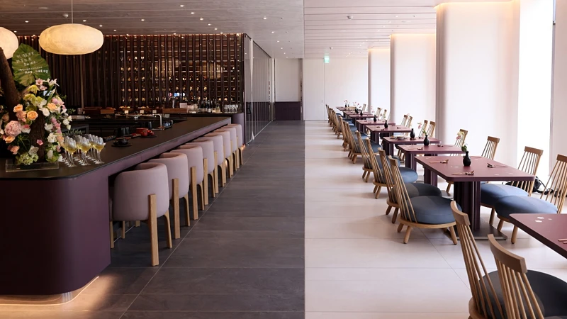 對於旅客來說最有感的,莫過於客房空間! 2024年完成150間客房整修,全採用牡蠣殼製成的無毒塗料「漆喰」、引入日本傳統工藝「左官」抹刀技法注入柔和圓弧輪廓。以及導入日本「間」設計概念,把常見的拉門改為階梯區隔空間。沙發、茶几、電視櫃維持同一水平高度,讓視野更為寬闊無阻礙。電視櫃上的花藝也更換成日本「池坊花道」,為整體風格增添一絲雅緻氣息,坐在床上往窗外看去便是一番享受。