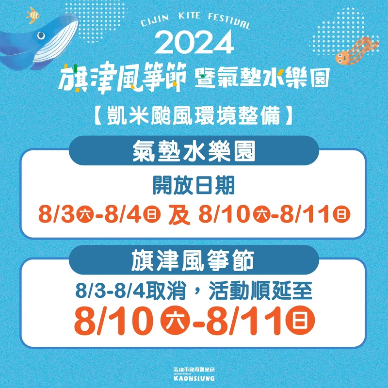 「2024旗津風箏節暨氣墊水樂園活動」將於7/20~21、7/27~28(因凱米颱風影響延期至8/3~4、8/10~11)等周末登場,更以「高雄熊的海洋派對」作為主題,會看到12高尺高雄熊領軍,以及鯨魚、大章魚、海龜等多種海洋生物,宛如把天空當作海洋,一齊升天開趴!百隻風箏齊飛,搭配旗津海天一色畫面,隨便拍都是壯麗大片呀。