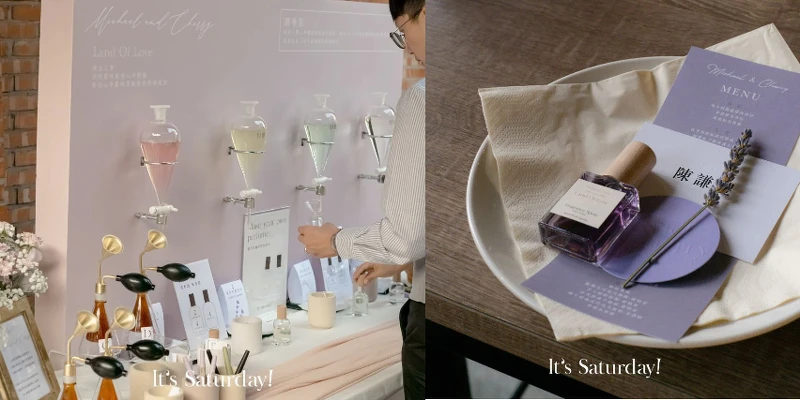 來自台灣原創香氛品牌 It’s Saturday,初衷為創立療癒、放鬆的香氛體驗,在環保永續的同時,展現出現代的家居美感跟療癒香氛,「再生與永續使用」這件事也能在日常生活中體驗。最新推出台灣首創「婚禮調香 BAR」活動,用簡單明瞭、快速及不失美感的方式,讓準新人及親友體驗到調香的樂趣,由專人引導調香,輕鬆調配出專屬自己的香水。