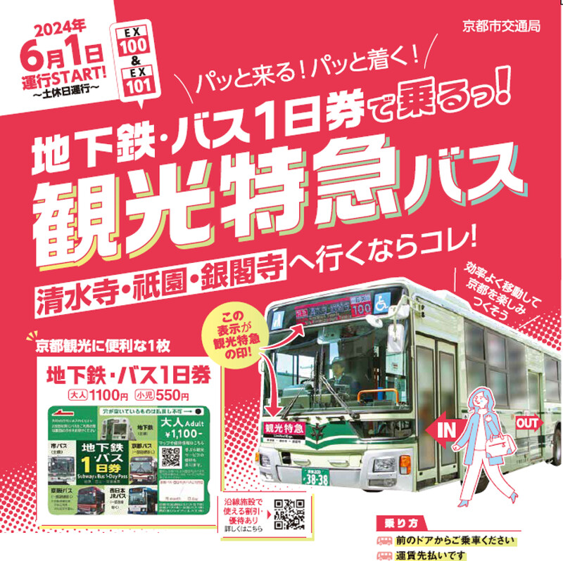 想要前往京都熱門觀光景點清水寺、祗園、銀閣寺等地,擔心週末與國定假日人擠人,推薦可搭乘京都新推出的「觀光特急巴士」,從2024年6月1日開始運行。由於僅停靠幾個著名觀光景點,大幅縮短搭乘時間。從京都車站前往清水寺十分鐘、祇園13分鐘、銀閣寺24分鐘,更加節省旅客的旅遊時間。