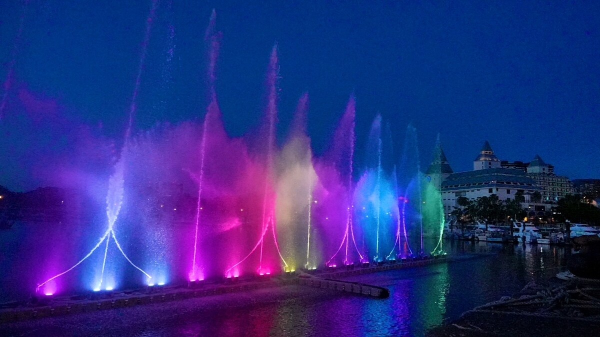 水舞展演時間:每日晚間19:00-21:00,每30分鐘一場,第一場與最後一場會結合燈光秀