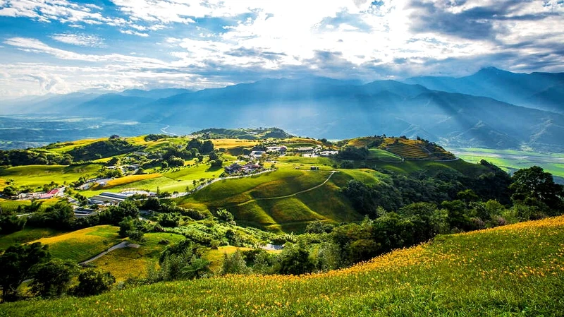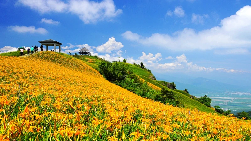 花東是金針花栽種區域,花蓮最佳賞花地點,當屬種植玉里赤科山、富里六十石山金針花季,今年都約有80公頃面積花海,宛如在大地上鋪上一條金色花毯,畫面相當舒心又療癒!記得站上「忘憂亭」俯瞰整座六十石山美景,搭配遠方的田野、農舍景緻,形成一幅自然風情畫作,入夜後還能觀賞清澈星空,同樣遼闊的景色都使人難以忘懷。