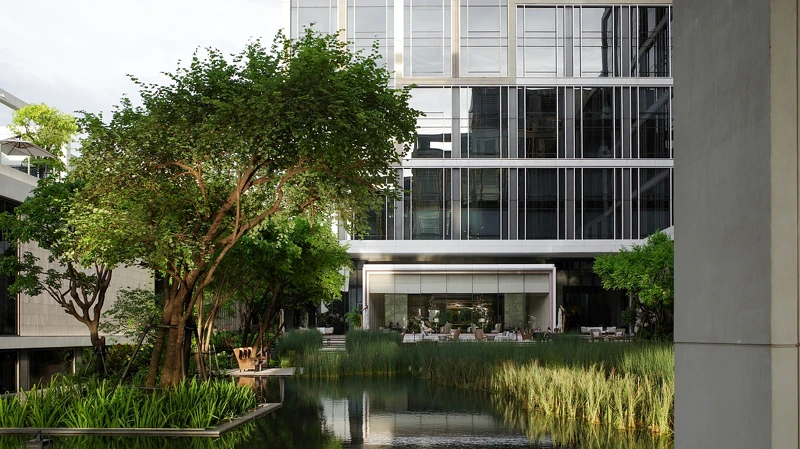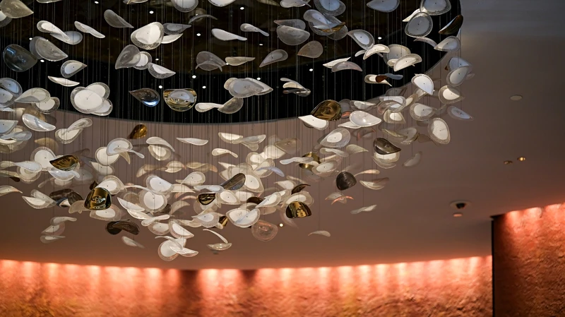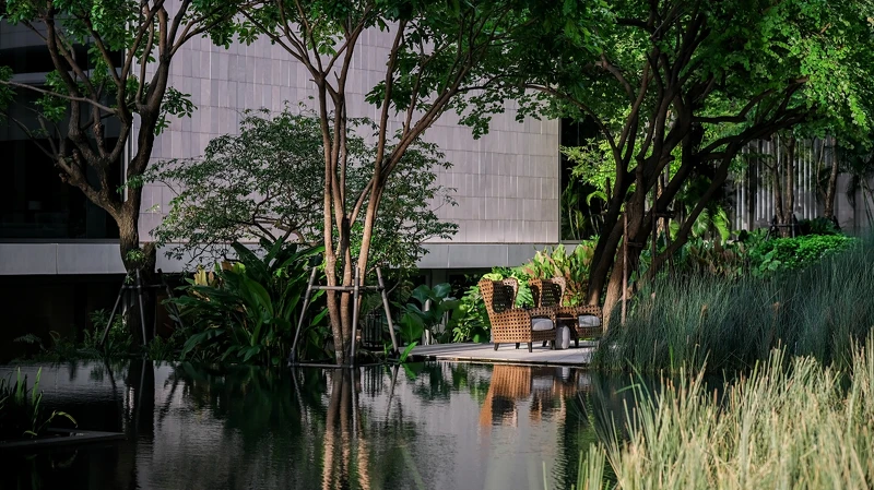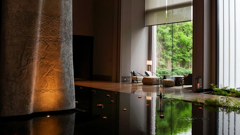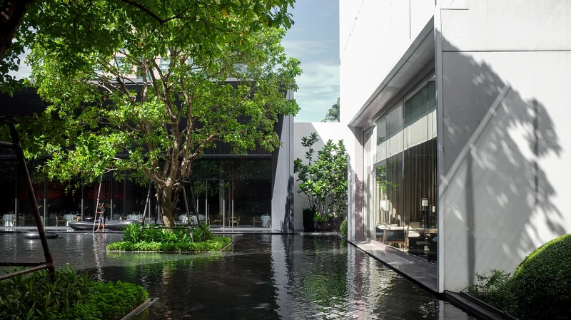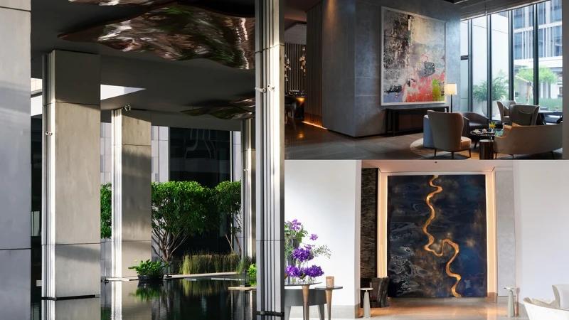從機場接駁轎車緩緩駛近酒店大門,立刻與城市的擁擠喧鬧隔絕開來。這間耗時10年才完工的城市酒店,交由傳奇酒店設計師Jean-Michel Gathy操刀,把鄰近昭披耶河的意象延伸進室內,像是大廳的鏡面水池、櫃台上方的雨滴裝置藝術、結合夕陽與河流的大幅作品,住客們能在這現代、寬敞又充滿蓊鬱綠意空間中慢下腳步、在大面落地窗引入充足光線下,細細欣賞等數百件藝術品交織出的沈澱氛圍。一旦踏入曼谷四季酒店,便立刻置身與城市截然不同的場域,用「奢華美術館」來形容也一點都不爲過。