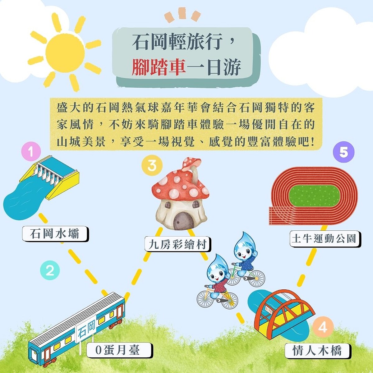 有興趣朝聖的人建議規劃「腳踏車一日遊」,推薦景點有石岡水壩、0蛋月臺、九房童話世界3D彩繪村、情人木橋、土牛運動公園、東豐自行車綠廊、梅子鐵橋、土牛客家文化館及五福臨門神木等;必吃美食推薦有蜂巢蛋糕、紅麴龍眼米糕、石山丘吐司、金碧椪柑、高接梨、義大利葡萄、甜柿及柳松菇,讓味蕾也能充分感受山城的美好。