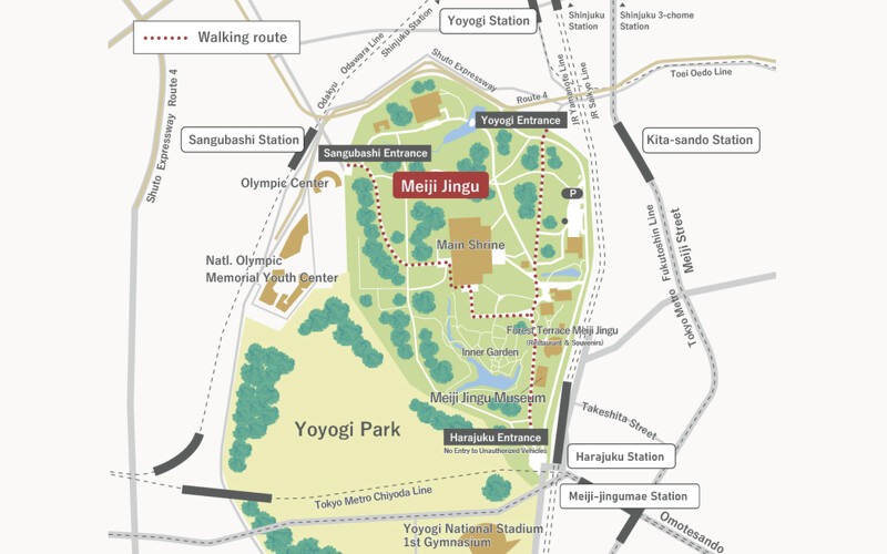 明治神宮雖然坐落在繁忙的東京,但距離佔地面積廣闊,橫跨數個車站,交通十分便利。入口共分為3個,幫大家整理了不同的建議交通方式,並由各入口步行約10分鐘就能抵達中央神社建築。