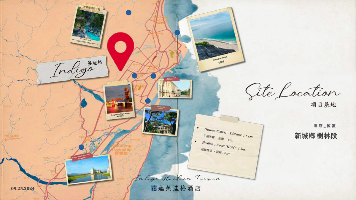 選址於花蓮縣新城鄉,花蓮英迪格酒店占地面積約為2.6公頃,距離花蓮火車站約1公里、花蓮機場4公里,方便全台甚至國際旅客造訪,並能快速前往太魯閣國家公園、七星潭、東大門夜市、松園別館等知名景點,預計2025年第三季開幕。