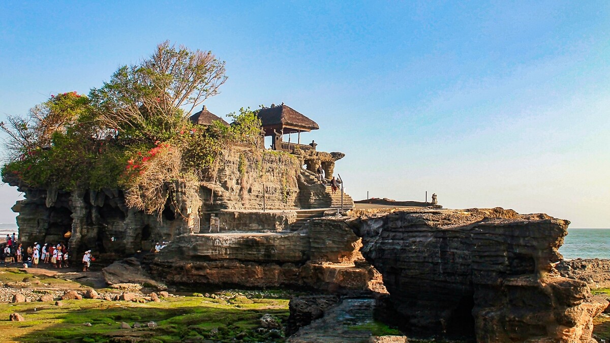 海神廟是15世紀時,一位名叫Danghyang Nirartha的印度教僧侶,發現某顆岩石有耀眼光芒,便認為這是祭拜海神的聖地。經過數百年後,海神廟依然是峇里島最具代表性的廟宇,連同其他六座濱臨海岸廟宇形成西南岸廟宇群,共同守護著當地人。海神廟建造在離岸大岩石上,因此只能等待退潮才能進到廟宇參觀,傍晚時分美麗的夕陽,也是必拜訪的原因之一。