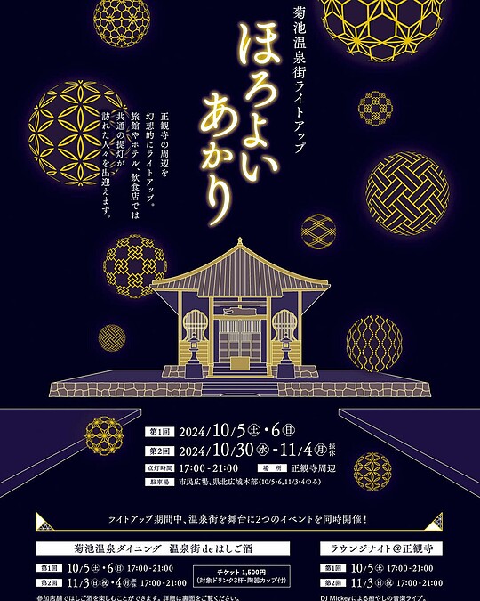 同樣是「溫泉百選」之一的菊池溫泉,今年正好是發現水源70周年,為慶祝這個特別的日子,菊池市特地舉辦一系列活動,包括了包括秋季黃昏夜市與點燈活動。與此同時,秋季也是菊池市傳統祭典「白龍祭」也將同步登場,相傳菊池地區在挖掘出溫泉的時候,憑空竄起了一隻白色巨龍,因此白龍也成為當地勇氣與驕傲的象徵。在「白龍祭」期間市區街上將有許多熱鬧的活動進行,除了手舉長達50公尺的白龍繞城外,活動最後將點燃近三千發的煙火劃破夜空,為整個節慶畫下完美句點。