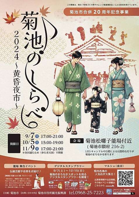 熊本縣菊池市(Kikuchi shi)位於縣內東北部,是由菊池市、七城町、旭志村和泗水町四個地方合併而成,主要的產業是農業和畜牧業,並以「菊池米」而聞名,在日本穀物檢定協會的排名中,已連續11次獲得「特等A」的殊榮。適逢秋季,菊池市也換上美麗的景色,知名景點「菊池溪谷」在日本擁有森林浴百選等多項名號,原本就壯麗的景色更增添一股詩意,搭配上「菊池溫泉」70周年慶典,將結合溫泉街的點燈活動和當地的季節性美食,讓今年的秋天又美又熱鬧。