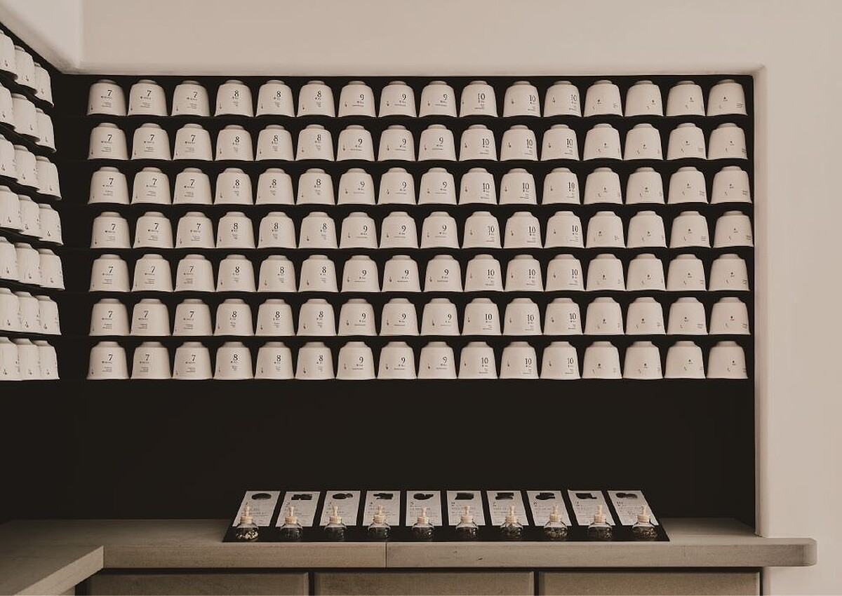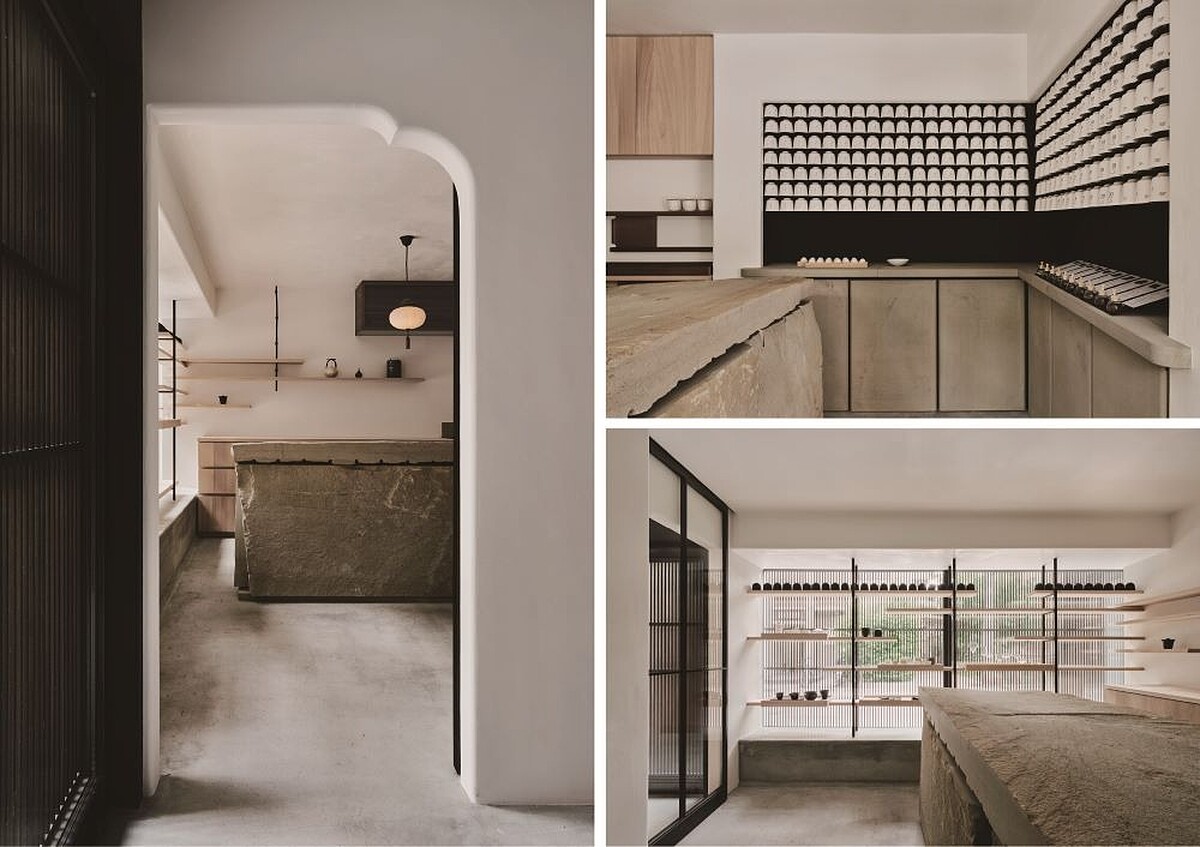 Ogata at The Shinmonzen 猶如祇園中的隱藏寶藏,讓人們用現代視角重新體會日本深厚的文化底蘊,店內左側展示了 T., Collection──這包裝採用可降解的天然材料、經過精心設計的日式混合茶,可根據每天不同心情或餐飲搭配飲用,鼓勵人們放慢腳步,將簡單的日常儀式帶回忙碌的生活中;又或是用來當作櫃檯的沉穩厚實石塊,來自日本茶鄉九州島,透過大地天然的蝕刻效果而成,可在此迎賓待客、包裝禮品與泡茶。