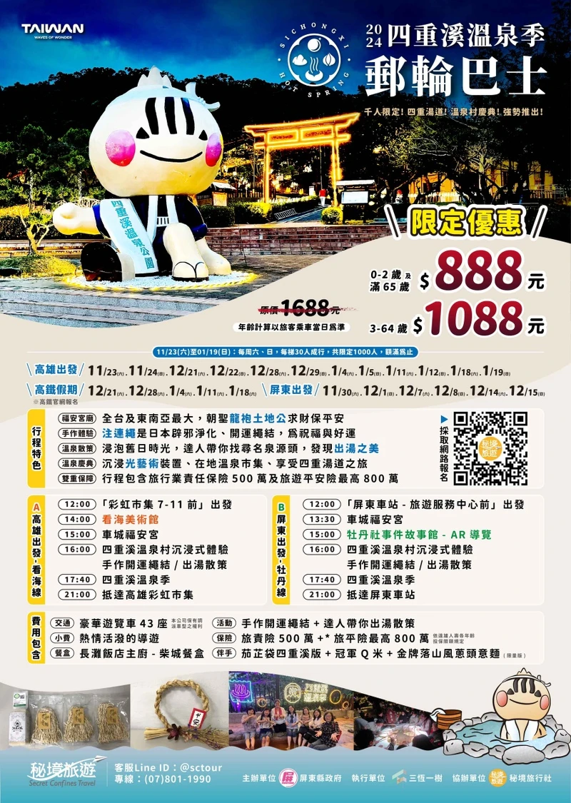 最後還有一項活動「郵輪巴士」限定六日出發,此一日遊行程包含遊覽看海美術館、車城福安宮、四重溪溫泉村、手作開運繩結、高雄彩虹市集、牡丹社事件故事館等。每梯30人便能成行,費用1088元、0-2歲/滿65歲則為888元。