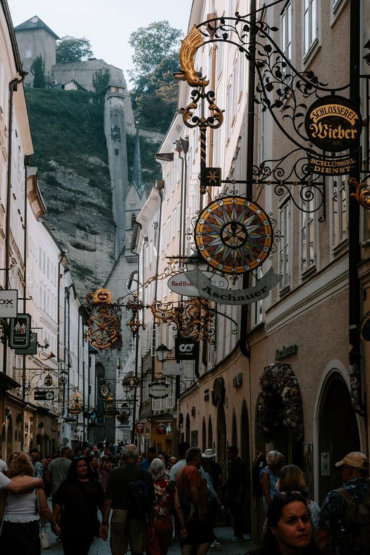 走著逛著,一幢顯眼的黃色建築吸引了我的目光,定睛一看,格特萊第街9號,是音樂神童莫札特的出生地就在這裡!莫札特是古典時期的音樂家,他短暫的一生創作了800多部作品,名聞世界的《小星星變奏曲》就是出自他之手。這裡展示著莫札特的文物與手稿,還有他們一家的居家環境、廚房、寢室等也都被完整保留,是認識這位稀世天才不可錯過的地方。離開故居,時間已接近傍晚,我們走過馬克小橋,沿著薩爾河畔散步,看著夕陽在要塞城堡落下,消失在薩爾斯堡的天際線,好不美麗。