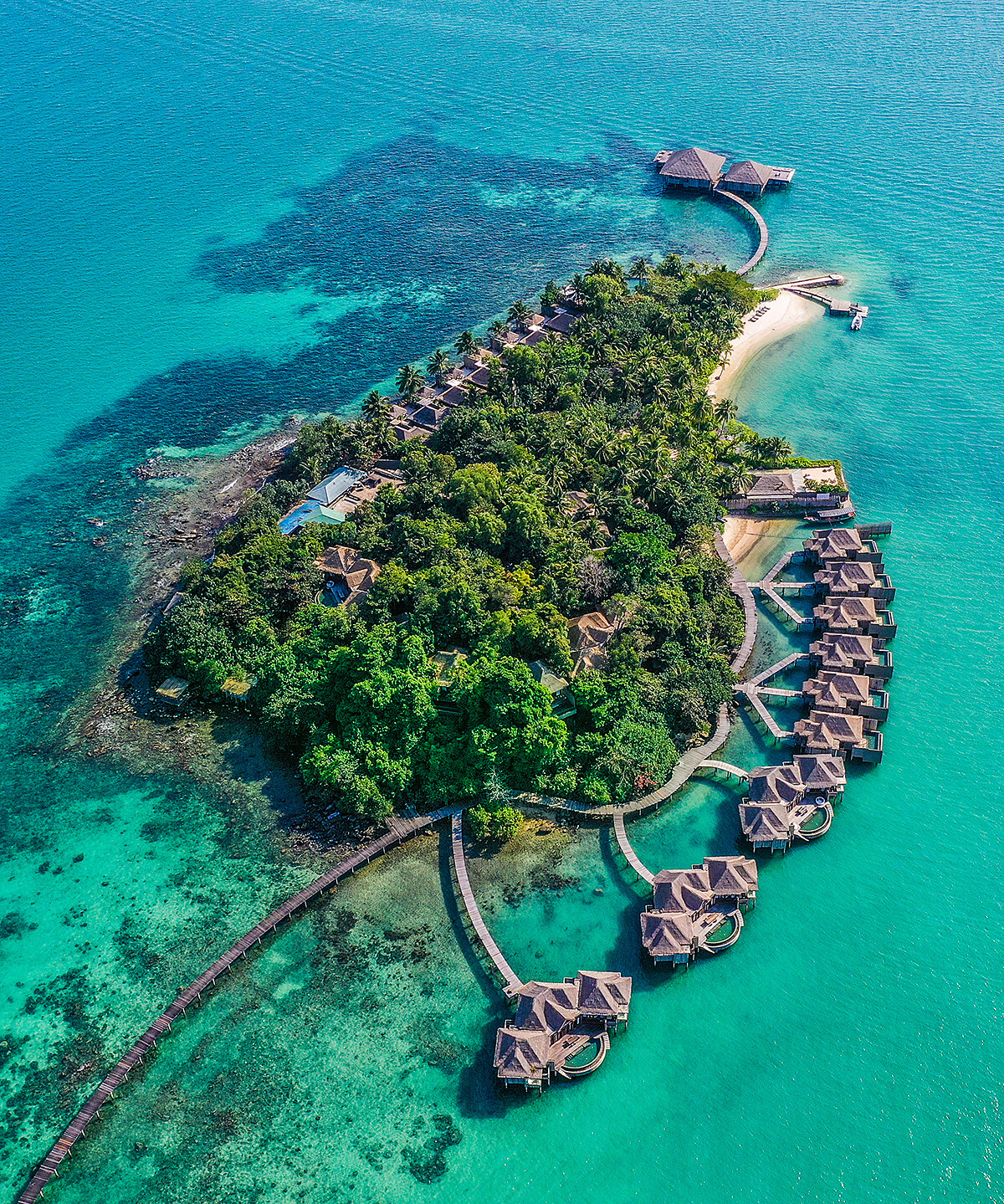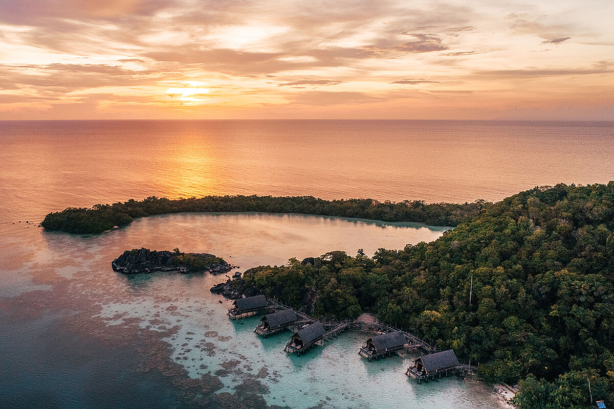 同樣是一島一飯店,但這處未經人為破壞的荒島是座完全擁抱大自然的度假村,要先從新加坡出發,再乘坐渡輪到印尼巴淡島(Batam),接著是一趟90分鐘的水上飛機旅程。其住宿空間部分為水上別墅,另有坐落於森林中的居所。