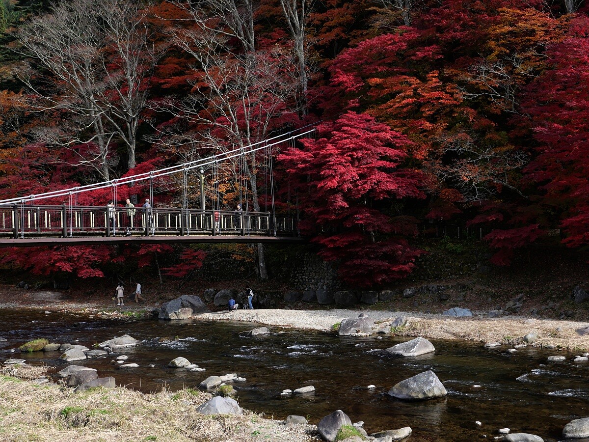 若提起人氣賞楓景點,位於栃木縣那須鹽原市的「紅色吊橋」絕對榜上有名!全長52.5公尺,橫跨箒川溪谷,每到紅葉季節,橋兩端的樹林就形成了一片火焰般的紅色奇景,加上吊橋的畫面宛如一幅畫作般。吊橋興建於2002年,用來連接「妙雲寺」的步行道,鄰近還有「鹽原物語館」,是一處介紹在地文化的會館,能自由入內參觀,或是來到足浴區,一邊泡腳一邊欣賞河岸景色。