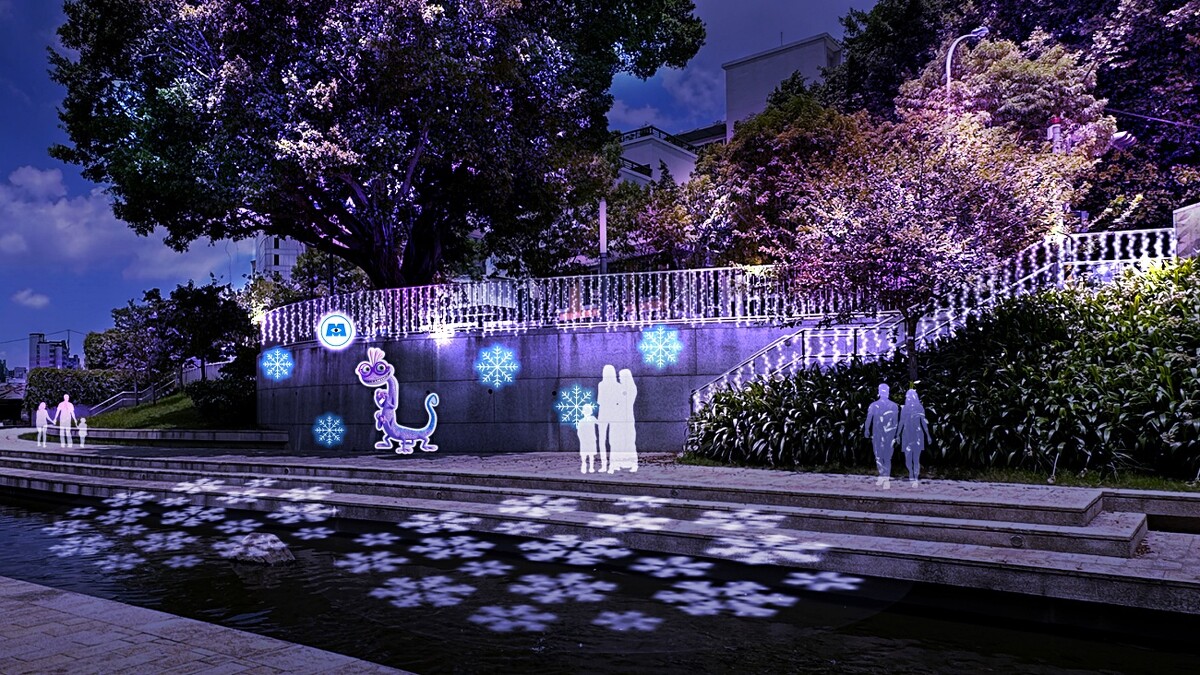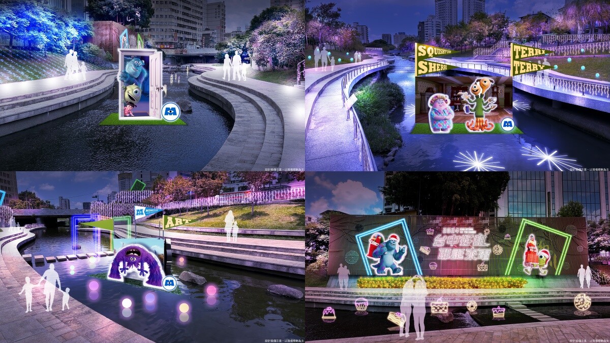 此次展區佈滿舊台中火車站、綠川水岸、柳川水岸,多達11個打卡點,包含柳川展區主舞台「幸福發電廠」會有燈光秀表演(每天下午5點半至9點半、每半小時一場),會看到絢爛燈光點亮河岸,是一年一度難得的吸睛畫面。「隱形迷蹤」、「超愛超甜」則有電影中的其他角色,搭配麋鹿、星星燈飾等節慶感元素點綴,營造浪漫佳節氛圍。