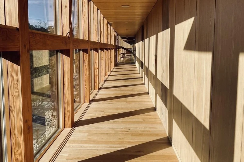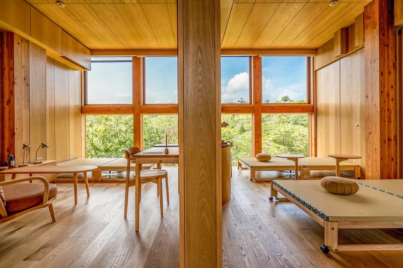 而這次的「禪坊靖寧」,更是坂茂「以自然治癒人心」理念的集大成之作,建築主要用日本國產杉木搭建,完全摒棄外牆,改用大片窗戶融入周邊的山景與自然光。站在頂層的木製長廊,四周都是綠意盎然的森林,空氣中彷彿都帶著草木香。(小編大力建議走進室內一定要脫鞋後好好感受,踩在木地板上感受那種溫潤的觸感,簡直是療癒的開端!)