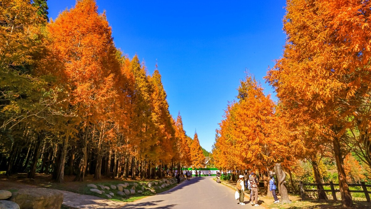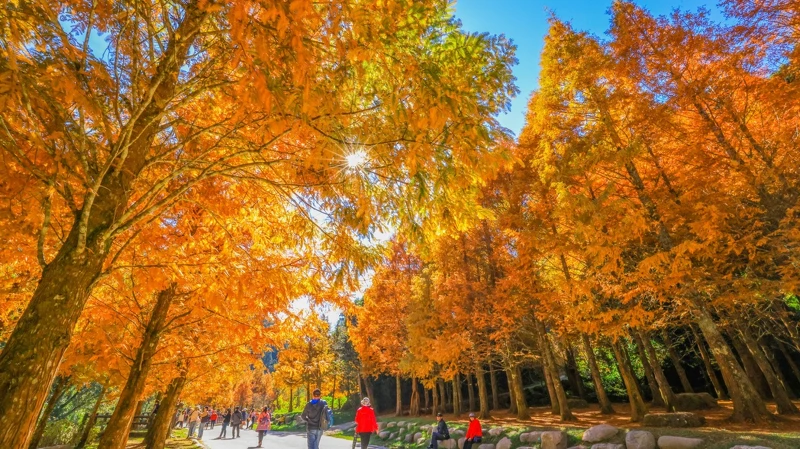 在盛放橘紅色調的楓樹後,12月中旬輪到800棵的水杉進入絕佳觀賞期!園區表示近年水杉相當受到遊客歡迎,因其在藍天陽光照射下,金黃色調更加燦爛耀眼,而若在湖面遠處回望,能收穫如明信片般的倒影夢幻景色,照片一出便迷倒大批網友。