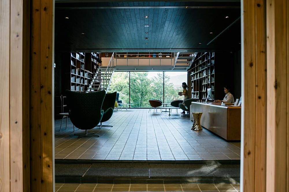 以「與書籍相遇」為題,「箱根本箱」可謂是「一間可買書的圖書館式飯店」,被綠意包覆的低調建築外觀,隨著落地木門打開,挑高的左右書牆與日光天井映入眼簾,搭配群山綠樹的落地窗景,連風景都充滿被閲讀的巧思。