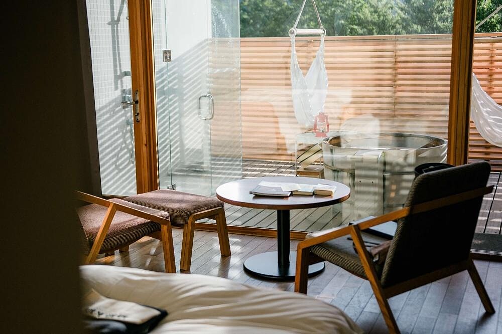箱根本箱的最初概念是「偶然的相遇」,比如空間裡的吊床、從房間走到浴池的路上,也可以在房間裡泡澡看著山林發呆......在這樣完全放鬆的時候,就算沒有特別想讀書的人,也會隨手拿起書來隨意地翻過去,然後發現原來還有這樣的世界啊!這便是我想創造的相遇。——岩佐十良