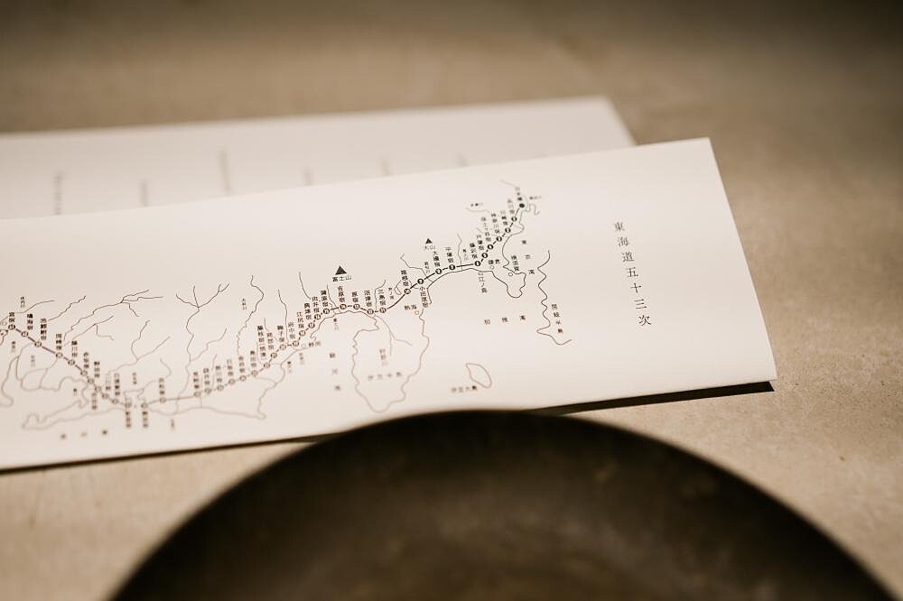 如果說閲讀在這裡是必然發生的精彩設計,那麼晚宴「東海道五十三次」便是令人驚艷的料理寶藏。東海道,指的是江戶時代用來連結江戶(現東京)與京都的大道,以江戶的日本橋為起點、至京都的3條大橋,整趟路程近5百公里,曾經是日本最熱鬧的道路之一,53次則是沿途53個住宿地點的總稱。