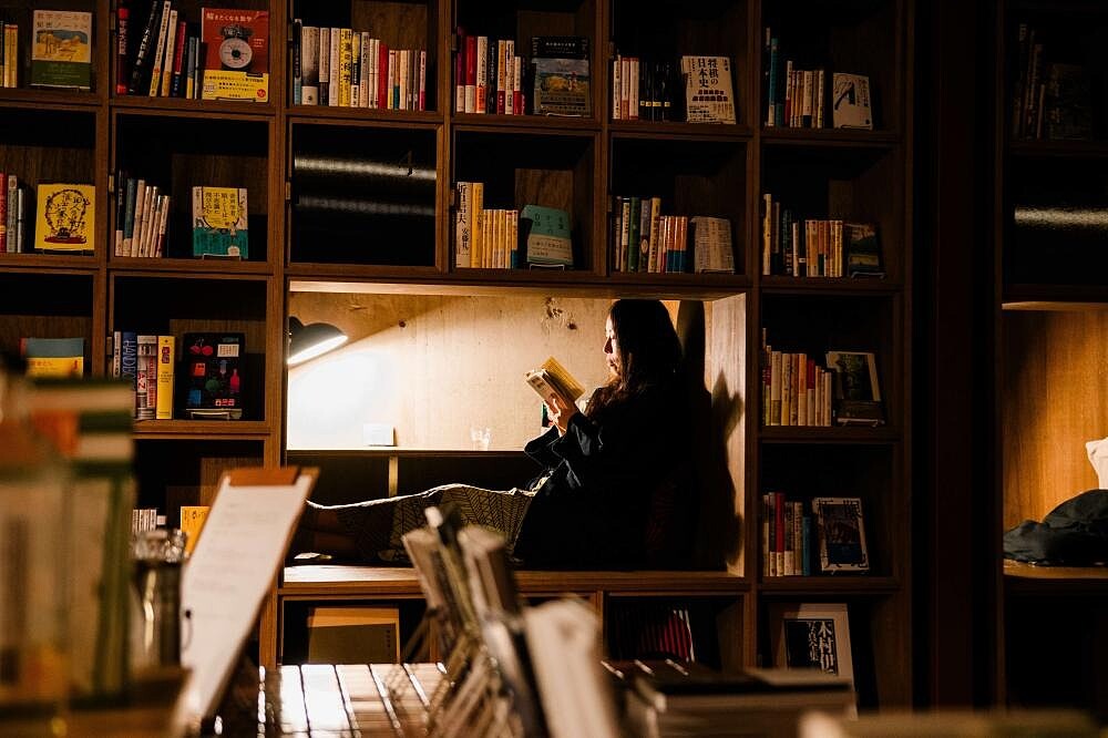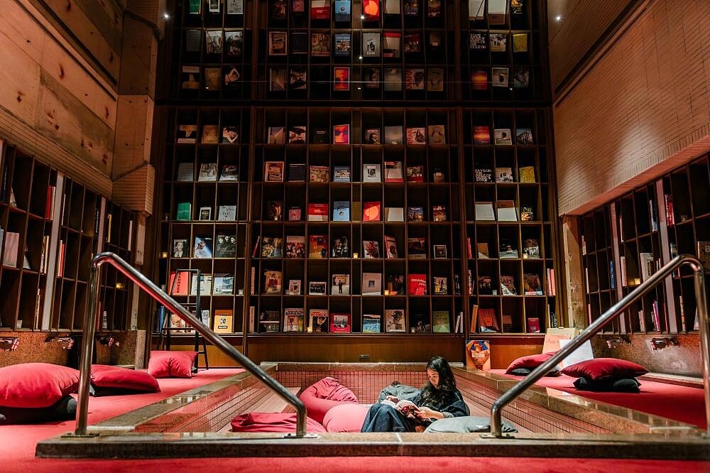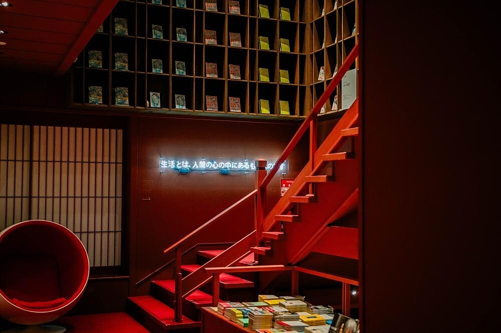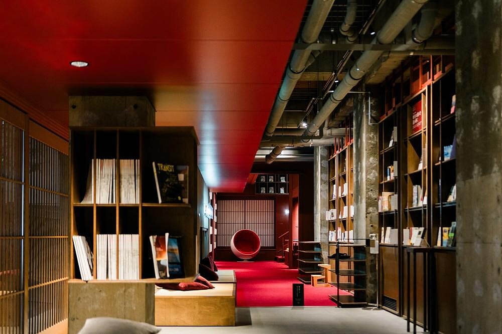 空間的趣味隨著動線移轉,「本箱」精神也發揮淋漓盡致,走廊邊間被陽光灑落的廂房、公共泉池旁的休憩長椅,所無不在的書牆、書櫃,收納來自各個領域如作家、攝影師、演員等名人書單,都讓人產生好奇與「這裡太適合坐下來看本書吧!」的感受,而入住箱根本箱,最棒的莫過於可將公共空間的書輯帶回房內閲讀,與書籍成為「旅伴」般的親密關係。