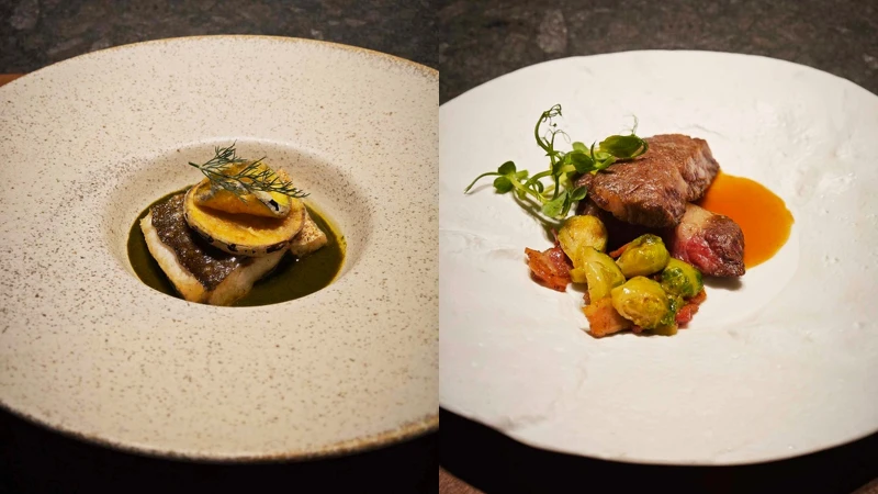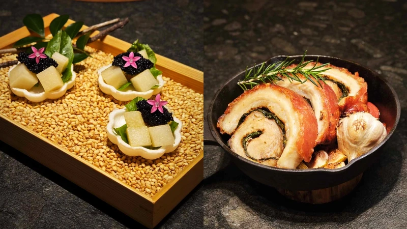 「Glamping Hygge Hill 山野森活」晚餐會隨著季節更換,現在換上加入北歐聖誕節靈感與園區內栽種的香草及蔬菜,徹底融入「產地到餐桌Farm to Table」的最夯飲食文化,從前菜、濃湯、義式脆皮豬肉卷、午仔魚、A5和牛及甜點奶酪,能充分品嚐冬日限定的東西交融美味。