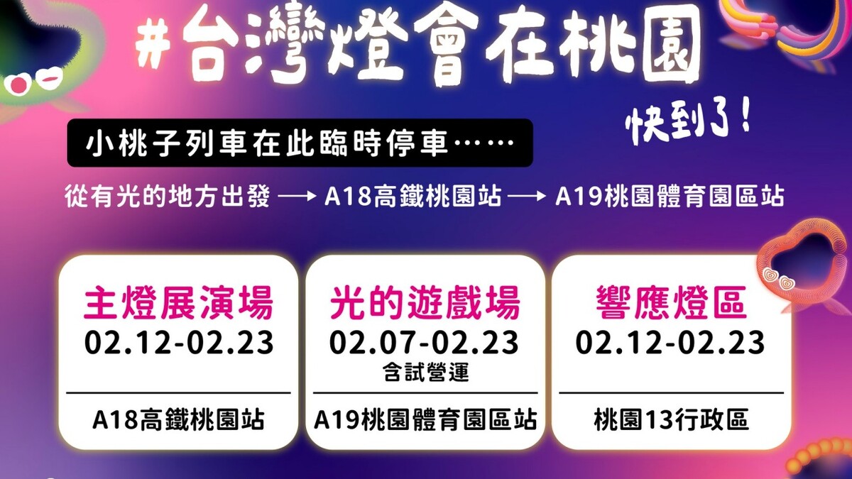 | 響應燈區 | 2/12~2/23 | 桃園13行政區 | 13大行政區在觀光旅遊景點、特色公園及交通節點佈置燈組,融合各區不同的風貌,結合不同族群、科技、親子、藝文、運動及生態環境做為策劃理念,讓元宵期間整座桃園都精彩可期。 |