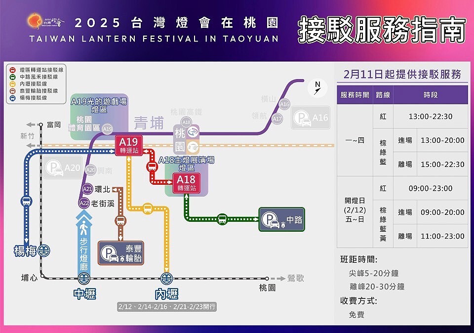 | 主燈展演場 | 2/12~2/23 | 高鐵桃園站 | 展出1座主燈、2大副燈、11大主題燈區,結合工藝、竹藝、互動科技及傳統燈藝等多元手法及媒材 |