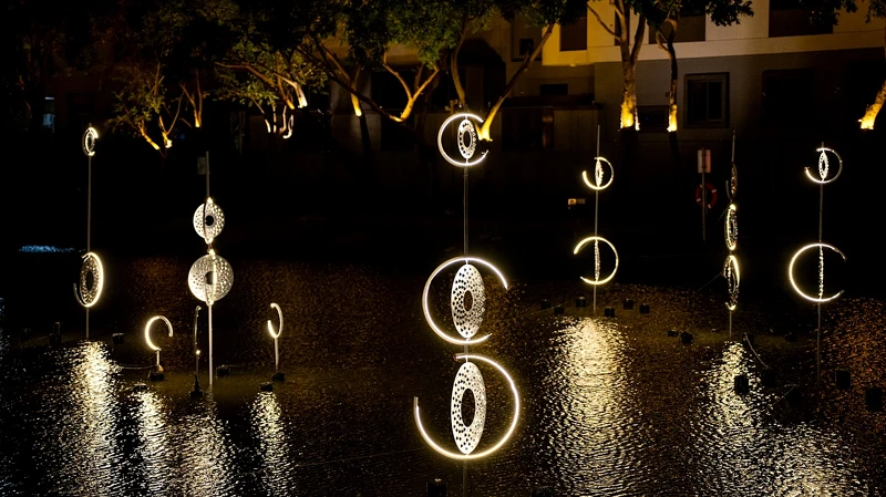 今年一共規劃藝術燈區、巷弄燈區、月津超新星、公19口袋公園等4大燈區,較為特別的是全新開闢的場域「公19口袋公園」,會依自然環境設置4件植物意象的《榮光幻花》作品,將臺灣常見的姑婆芋、蕉葉、蒲公英、野花造型,利用金屬轉譯,藉由一座座巨型花朵雕塑與光環境交織出童話花園。