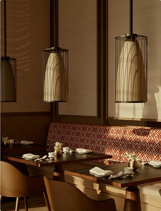 餐廳位在「Janu Tokyo」5樓大廳旁,空間則以熱情的紅色為主調,與低調神秘的門面形成強烈的對比,加上高挑的天花板搭配編織藤牆、上海磚和竹編細節,重新詮釋了經典的中式餐廳的空間風格。