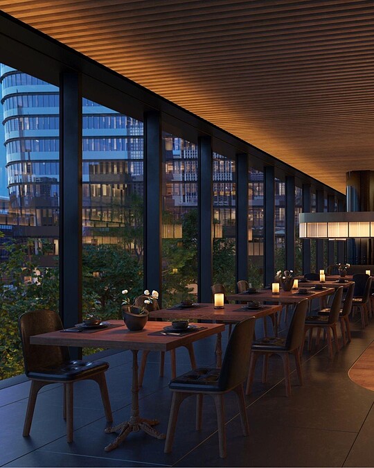 餐廳嚴選有機時令食材、海鮮與肉類,以炭火細膩烹調,從黑花和牛(Kurohana Beef) 到炭烤藍鰭鮪魚,每道料理皆可搭配精選美酒與清酒。置身其中,不僅能品味匠心獨運的料理,還能欣賞麻布台之丘的花園以及東京天際線的景色。