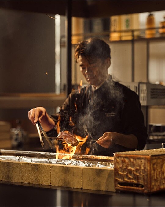 以現代手法詮釋炭火燒肉(Sumibiyaki),為 Omakase 的供餐方式,以鉚接銅吧台與開放式廚房營造時髦當代的空間,並融合傳統日本炭火燒烤的溫暖。板前僅設有13個座位,可圍坐於炭火燒烤台前,近距離欣賞料理過程,感受炭火燒烤的極致風味。